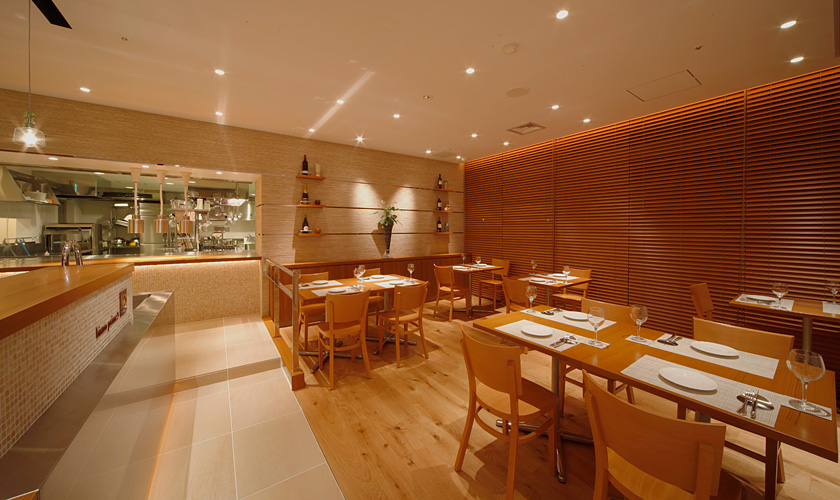 お仕事後に気楽に立ち寄りたくなるような親しみのあるビストロらしい空間。厨房の臨場感に楽しい会話も弾みます。